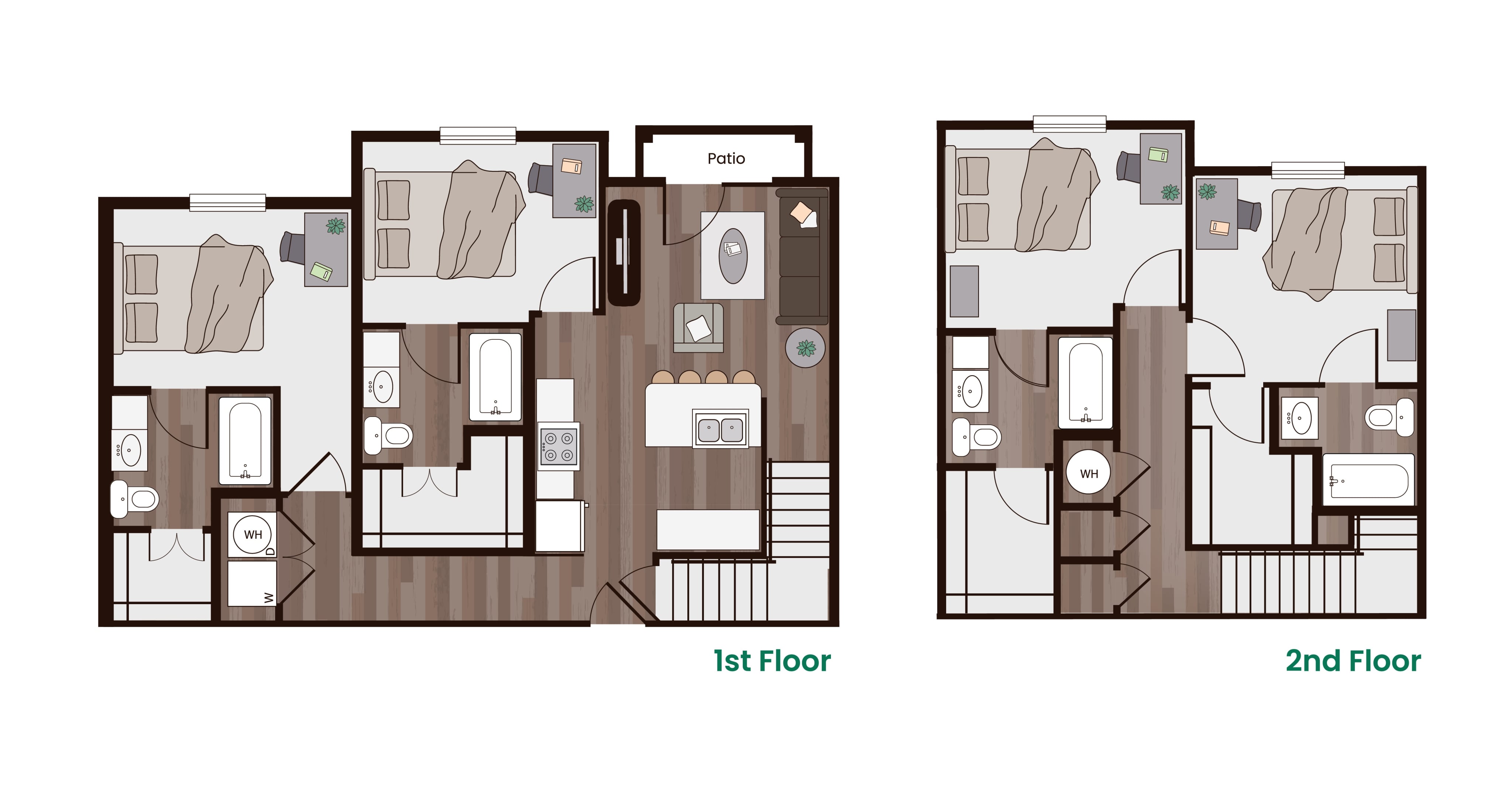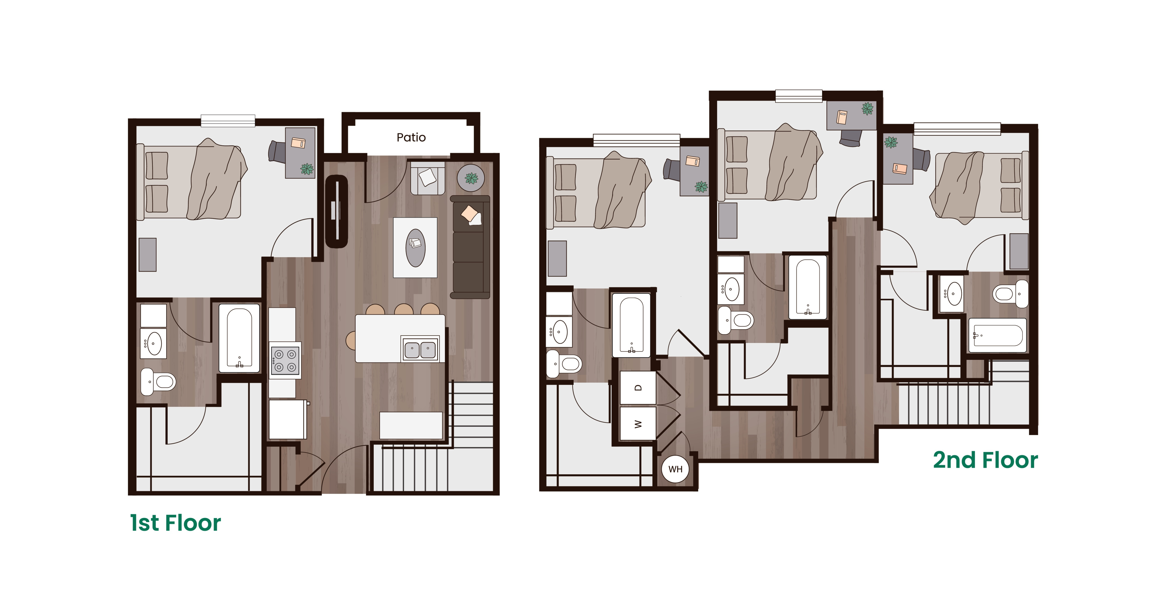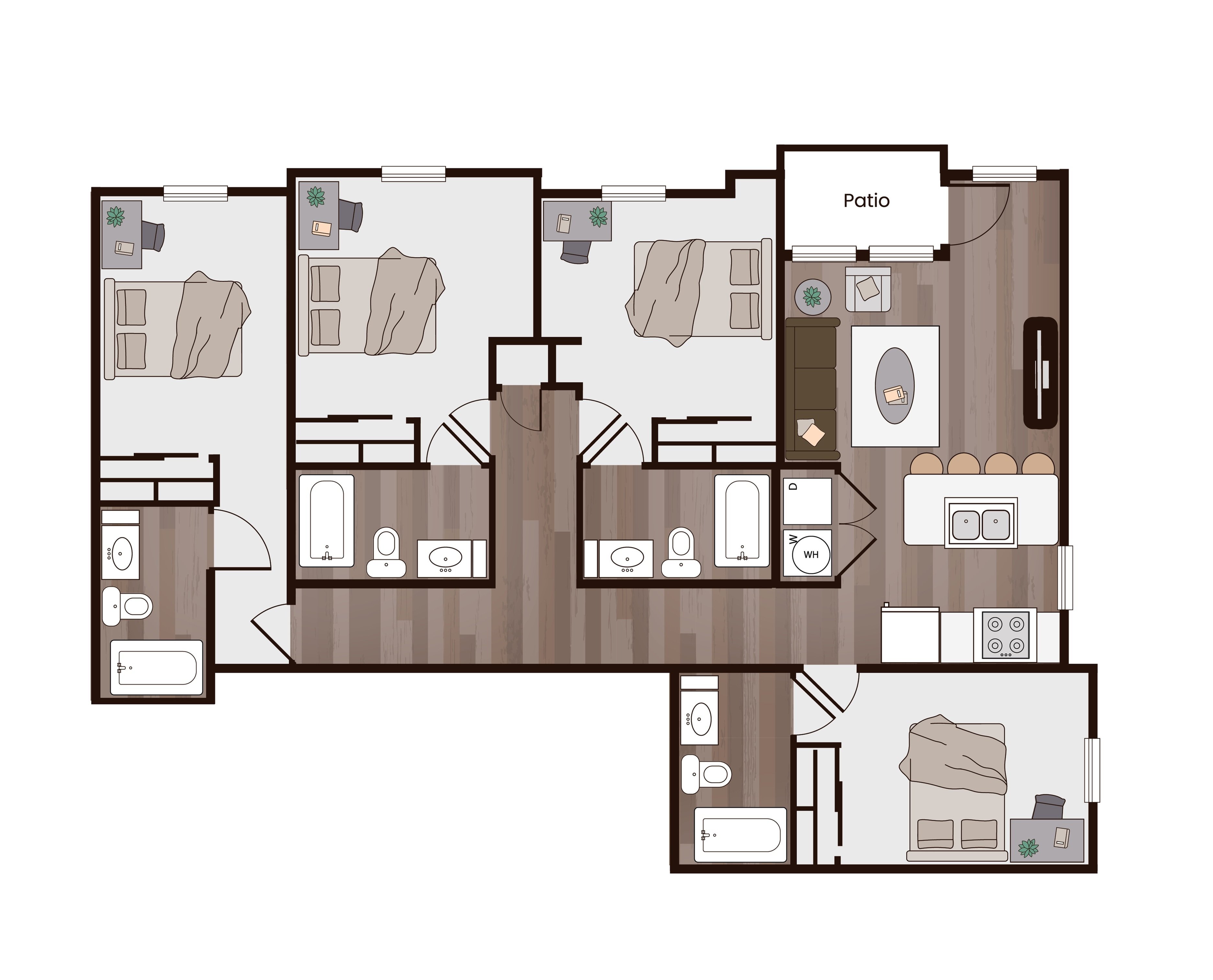 The TH2 is built for Clemson students who want it all — space, style, and a true sense of home. Featuring large bedrooms, private bathrooms, and an expansive living area, it’s perfect for roommates who love entertaining or studying together. This floorplan captures the energy of campus life with the comfort of modern off-campus living.