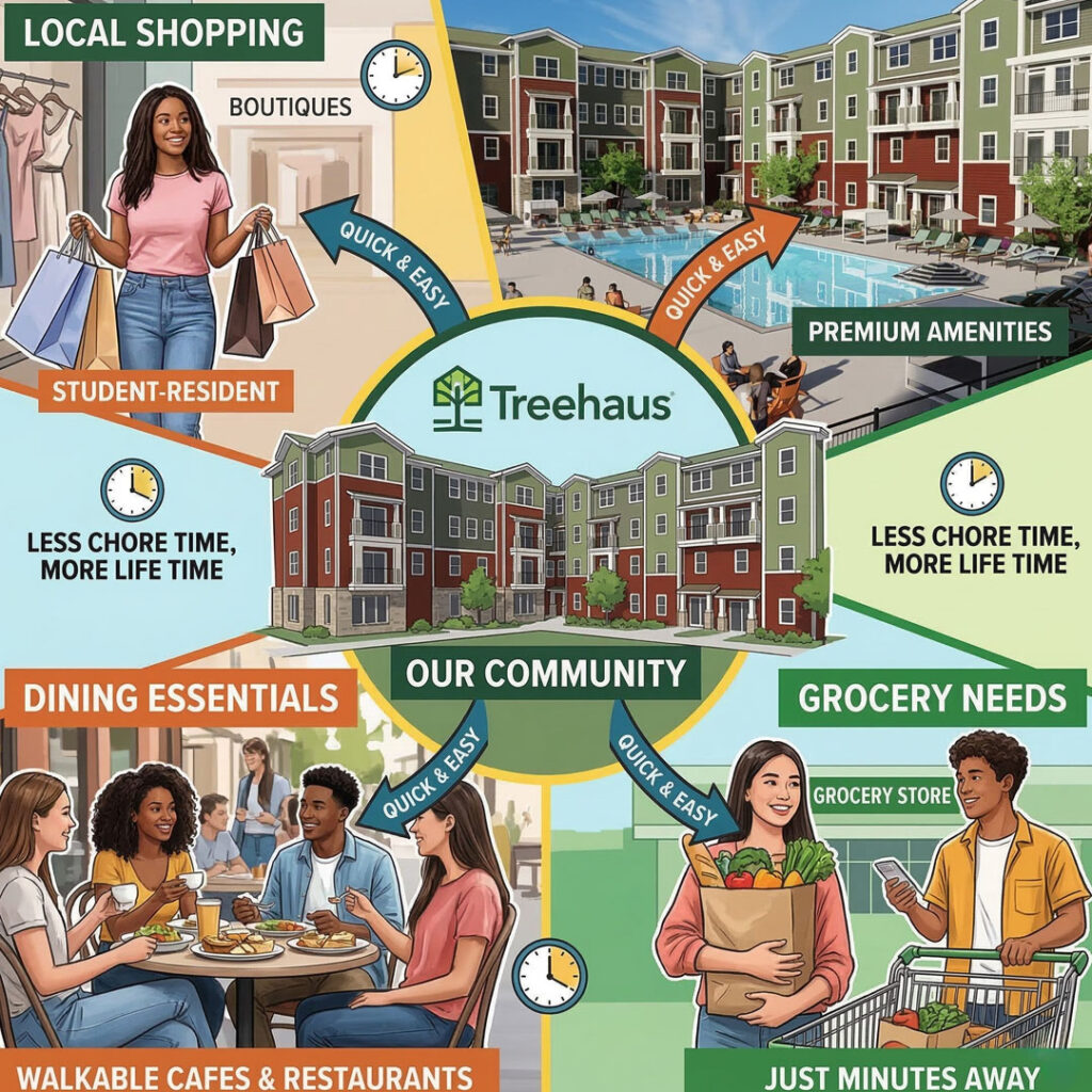 Efficiency is key to a successful semester. The Treehaus location ensures you are never far from local shopping, dining, and grocery essentials. We have positioned our community so that your daily errands are quick and easy. This convenience ensures you spend less time running chores and more time enjoying the premium lifestyle amenities we offer our residents.